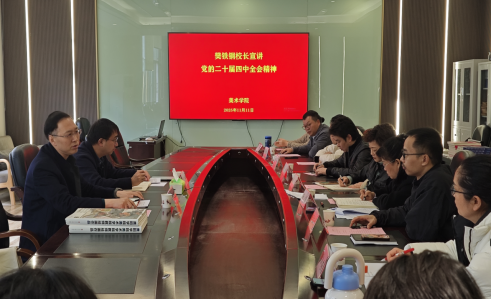 1111午,学校党委副书记校长樊铁钢到美术学院 宣讲党的二十届四中全会精神并调研校长办公室主任曾旭葵陪同。
